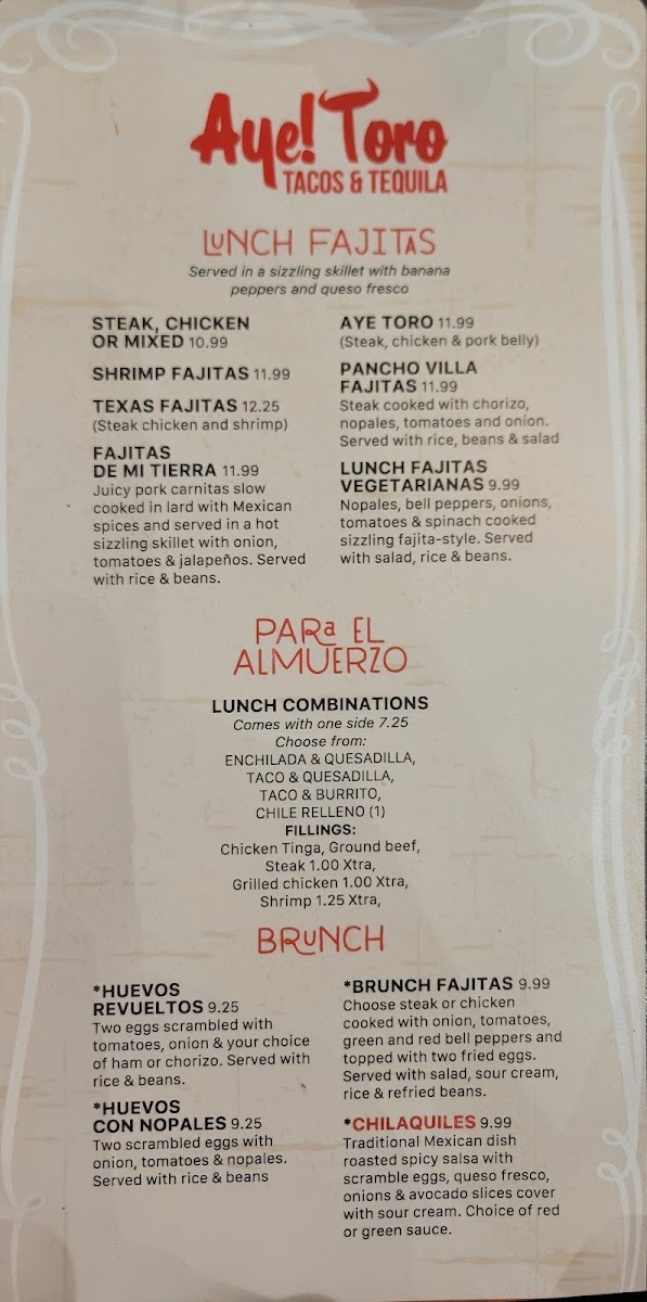 Welcome to Aye! Toro Tacos & Tequila - Sanford, where the vibrant essence of authentic Mexican cuisine comes alive! Located at 3064 S Horner Blvd, this culinary gem delights patrons with a diverse menu that highlights traditional flavors and fresh ingredients.
